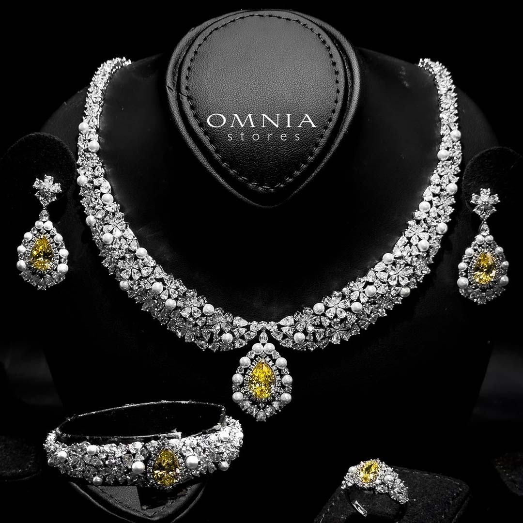 Illuminate your wedding day with the radiant charm of the Omnia Aiyesha Yellow Bridal Full Set — a breathtaking ensemble designed for brides who dare to shine. Adorned with high-quality yellow zircon stones that exude warmth, joy, and royalty, this set is beautifully finished with rhodium plating for a lasting, tarnish-free brilliance.