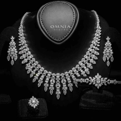 Elevate your bridal ensemble with this meticulously handcrafted set, including a statement necklace, matching drop earrings, a delicate bracelet, and an adjustable ring. Adorned with high-quality white zircon stones and finished in a sleek rhodium plating, it’s designed to offer lasting brilliance without tarnish—perfect for luxurious weddings and formal occasions in the GCC.