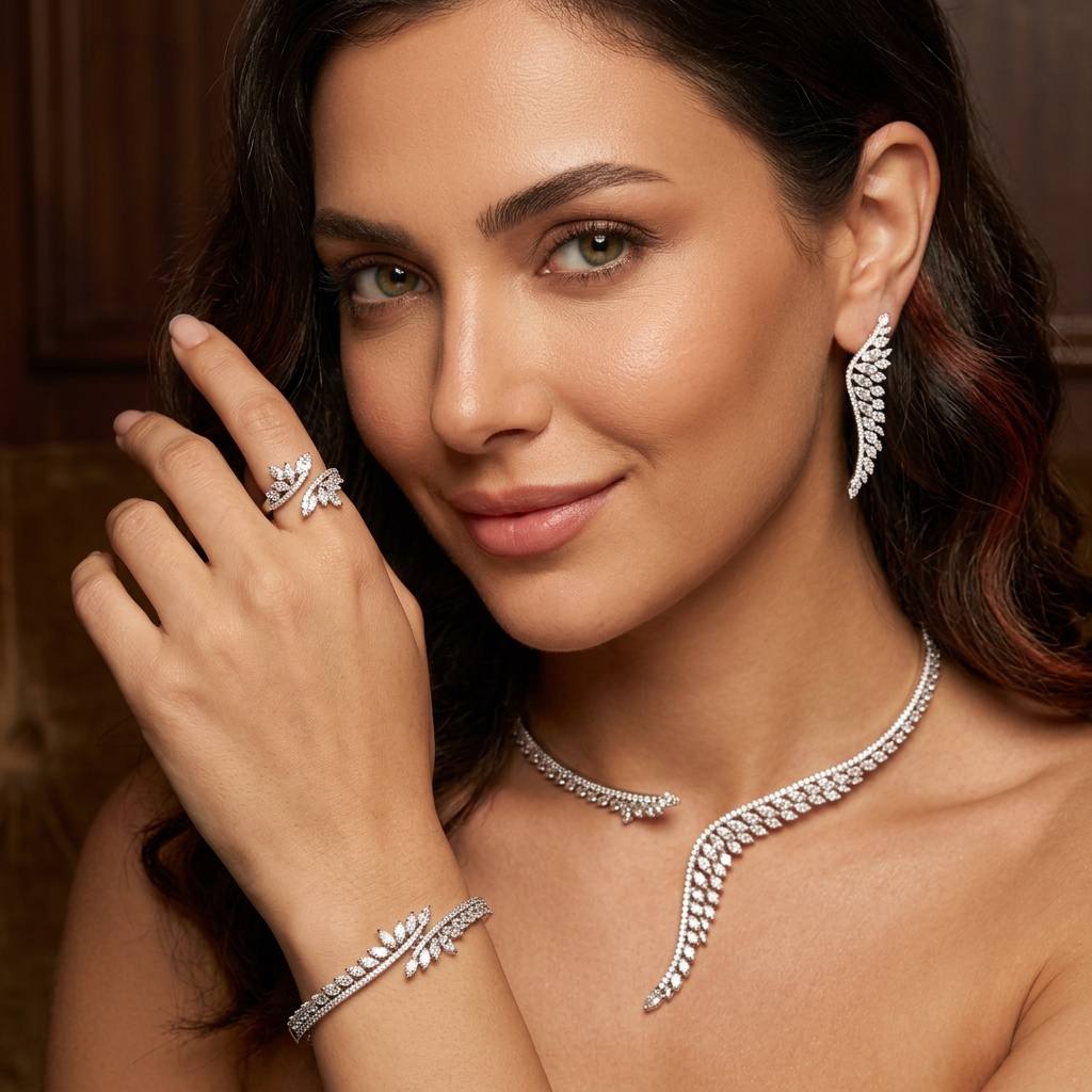 Make a statement of elegance and grace with the Saleh Luxury White Feather Leaf Bridal Full Set, beautifully designed for women who appreciate refined luxury in the GCC. Inspired by delicate feather and leaf patterns, this exquisite set features a flowing marquise-style arrangement that symbolizes beauty, femininity, and timeless sophistication.
